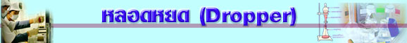 | หลอดหยดมีลักษณะเป็นหลอดแก้วที่ปลายข้างหนึ่งยาวเรียวเล็ก และปลายอีกข้างหนึ่งมีกระเปาะยางสวมอยู่ หลอดหยดใช้สำหรับดูดรีเอเจนต์จากขวดไปหยดลงในหลอดทดสอบที่มีสารอื่นบรรจุอยู่ เพื่อใช้ในการดูปฏิกิริยาเคมีของรีเอเจนต์นั้นๆ