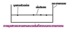 3. หยดสารละลายที่ต้องการจะแยกด้วยปิเปอตต์รูเล็ก ลงบนกระดาษกรองตามแนวเส้นที่ลากไว้ให้มีระยะห่างพอสมควรแล้วตั้งทิ้งไว้ให้แห้ง