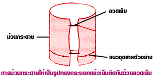 4. ม้วนกระดาษให้เป็นรูปทรงกระบอกแล้วเย็บปลายทั้งสองข้างให้ติดกัน แต่อาจใช้แถบกระดาษเล็ก ๆ แทนก็ได้