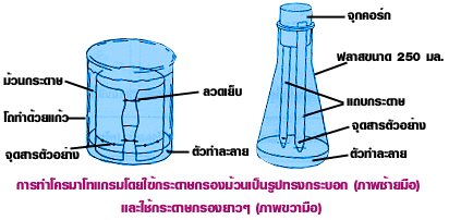 7. นำม้วนกระดาษกรองที่ทำเตรียมไว้ในข้อ 4 มาใส่ในภาชนะที่เตรียมไว้ในข้อ 6 (ต้องให้จุดบนกระดาษกรองอยู่เหนือตัวทำละลายเล็กน้อย และอย่าให้กระดาษกรองสัมผัสกับข้างภาชนะ) ปิดภาชนะเพื่อป้องกันมิให้ตัวทำละลายระเหย