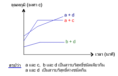 เนื้อเดียวกันของ a กับ c, a กับ d และ b กับ d ไปกลั่น หาความสัมพันธ์ระหว่างอุณหภูมิกับ