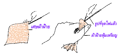 - 1. จุดธูปแล้วนำมาจี้ที่เศษผ้า ชี้ให้เพื่อน ๆ ดูตรงรอยไหม้ที่เป็นรู
