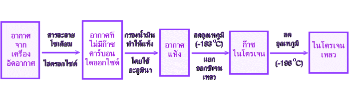 การทำไนโตรเจนเหลว หลักการทำ คือ ลดอุณหภูมิ วัตถุดิบที่ใช้คือ อากาศ นอกจากนี้ใช้สารละลายโซเดียมไฮดรอกไซด์ (NaOH) สำหรับดูดก๊าซ CO2 และอะลูมินา (AI2O3) สำหรับดูดความชื้น ทำให้อากาศแห้ง