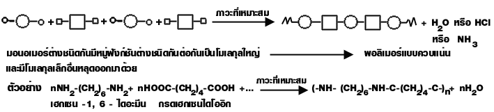ข. โคพอลิเมอร์ เป็นพอลิเมอร์ที่ประกอบด้วยมอนอเมอร์ต่างชนิดกัน เช่น โปรตีน พอลิเอสเทอร์